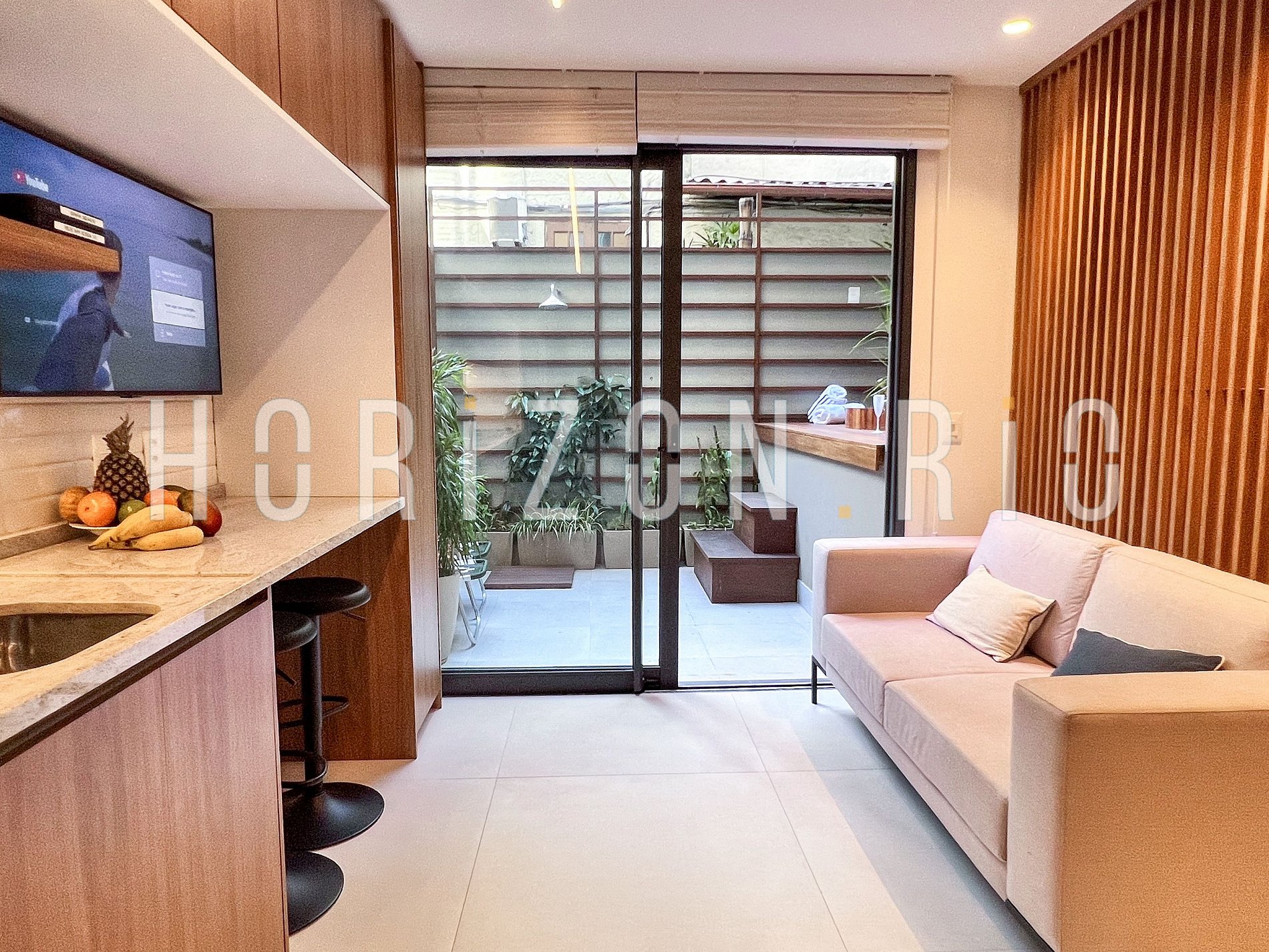 Um dos destaques deste apartamento em Ipanema é o seu jardim privado, que conta com um chuveiro ao ar livre e um relaxante SPA japonês, perfeito para momentos de descontração após um dia explorando as belezas da praia de Ipanema. O ambiente é cuidadosamente projetado para maximizar a iluminação natural, criando um espaço acolhedor e convidativo.